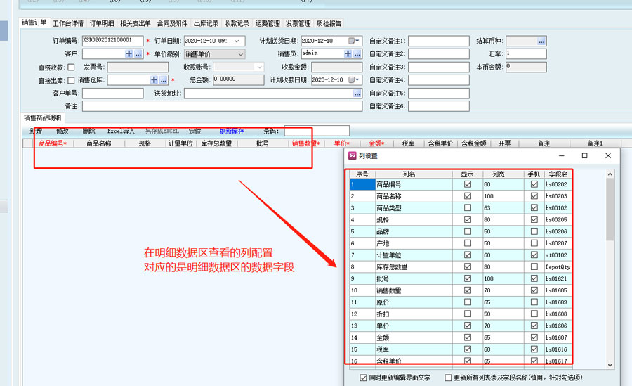 右鍵點擊明細數據的空白地區后,選擇點開列配置,在彈出窗口中查看明細數據對應的字段名。