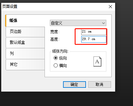 4.也可以自己填寫寬度和高度。A4紙的尺寸是21*29.7。聯紙的則不一定是固定尺寸,可能是21*14.8,也可能是21*14。為了避免尺寸對不上,可以用尺子量下具體尺寸再填寫長度和寬度。修改后保存即可。