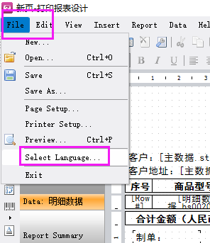 方法:可以點擊報表編輯界面的左上角File,選擇Select Language。