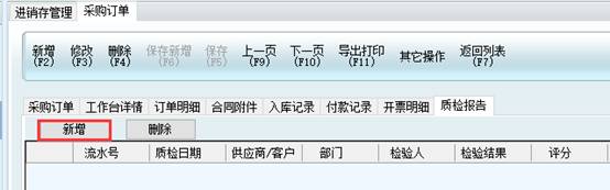 下面以采購訂單為例,保存采購訂單以后,要在質(zhì)檢報告上做驗收。