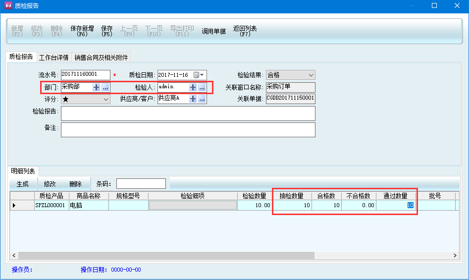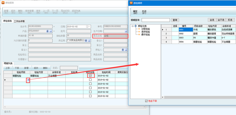 選擇質(zhì)檢部門,檢驗人默認是操作人,自動帶出供應商名稱和關聯(lián)單據(jù)編號,