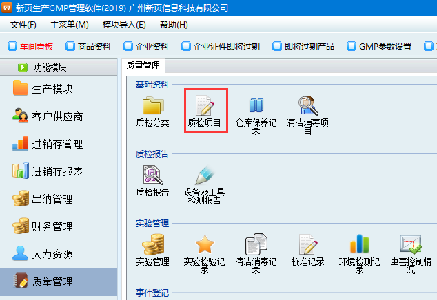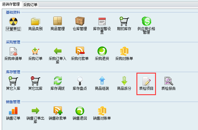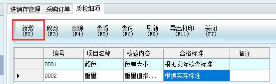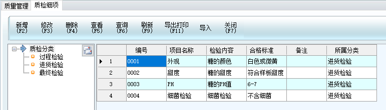2、先在質(zhì)量管理模塊-質(zhì)檢項目中添加質(zhì)量細項