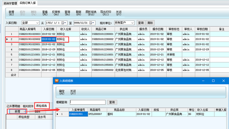 3、以采購入庫單為例,先選中需要添加質(zhì)檢報告的采購入庫單,然后再下方點擊質(zhì)檢報告,再點擊新增,在彈出的窗口中選擇要質(zhì)檢的商品