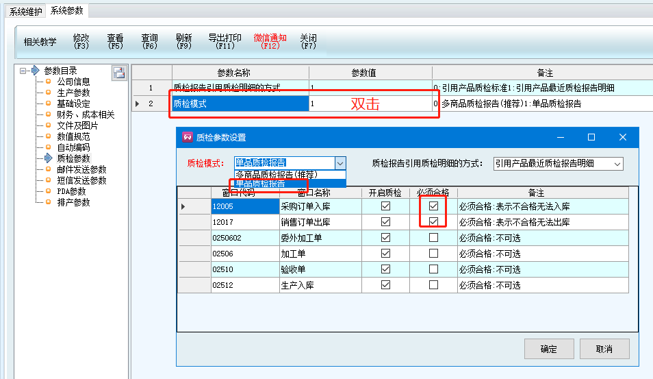 在系統(tǒng)維護——系統(tǒng)參數(shù)——質(zhì)檢參數(shù)——采購訂單(銷售訂單)——開啟質(zhì)檢(必須合格)