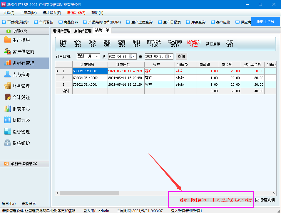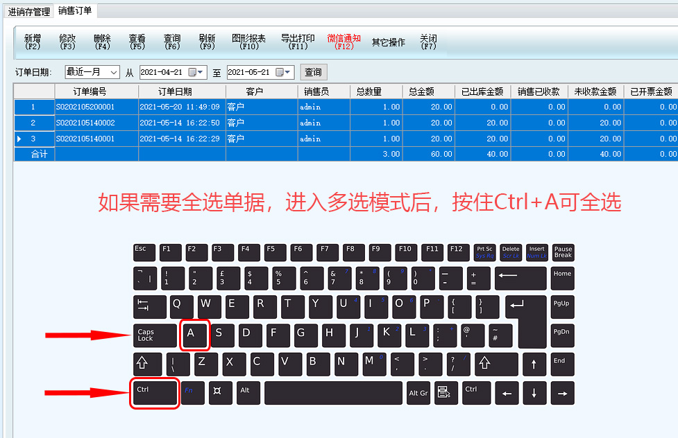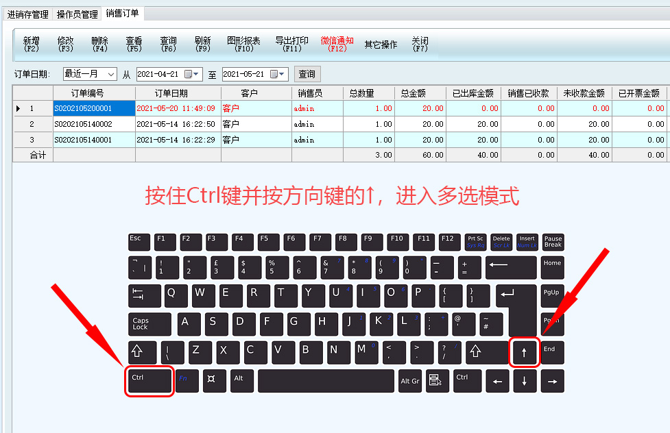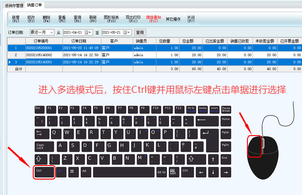 2、按住CTRL鍵+↑,進(jìn)入多選模式后,按住CTRL鍵,用鼠標(biāo)左鍵點(diǎn)擊選擇單據(jù)。