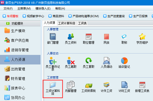 3、在人力資源-工資計算科目,如下圖,輸入項是可以根據企業自身的情況來手動輸入的。計算項是軟件默認的公式,也可自己修改公式。例如這里做2018年12的工資表,點擊菜單欄新增工資表,然后選擇月份,填寫工資表編號,如果勾選從已有的工資表復制,則需要選擇復制哪個月份的工資表,然后點擊確定。(每個月新增一次工資表)