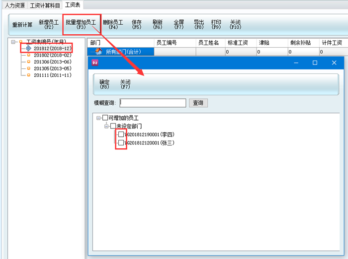 4、打開人力資源-工資表,左邊點擊工資表編號,然后點擊批量增加員工,勾選需要的員工姓名。