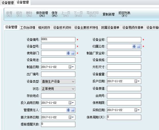 1)設(shè)備管理:建立設(shè)備基本資料,對(duì)設(shè)備編號(hào)、命名、記錄制造廠家、制造日期等基本信息;