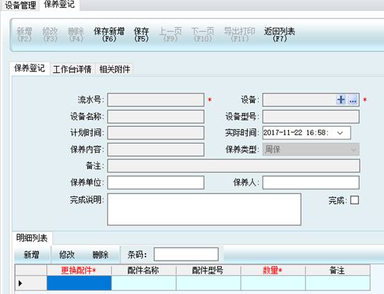 3)保養(yǎng)登記:記錄設(shè)備保養(yǎng)需要配件明細(xì)、數(shù)量、保養(yǎng)人、完成情況說(shuō)明;
