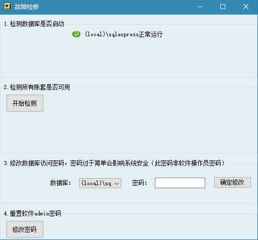 安裝完成后打開服務端----幫助----故障檢測,修改數據庫密碼。