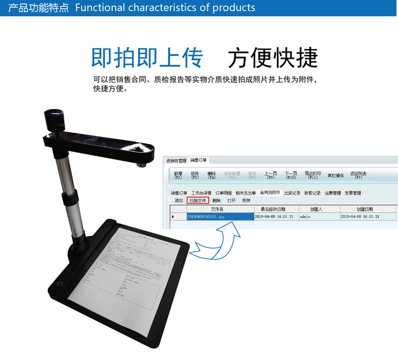 2、使用方法:在可上傳附件的模塊,文件放在文稿臺,點擊掃描文件--拍照--確定照片,即可立即上傳為附件。