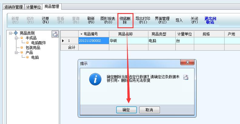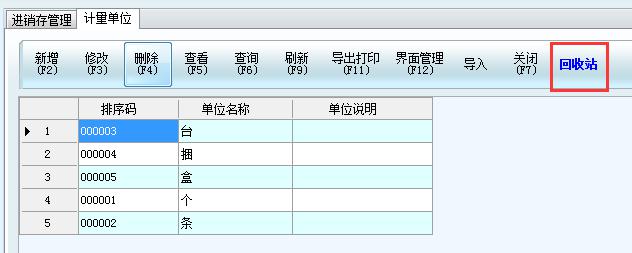 商品管理、計量單位、倉庫管理、員工資料等基礎資料的界面,有回收站的設置,刪除基礎資料時,會首先刪除在回收站。此時再錄入原來的同名資料時,會提示已存在。需要在回收站里面徹底刪除,才能再次錄入。