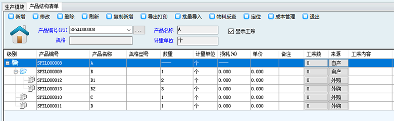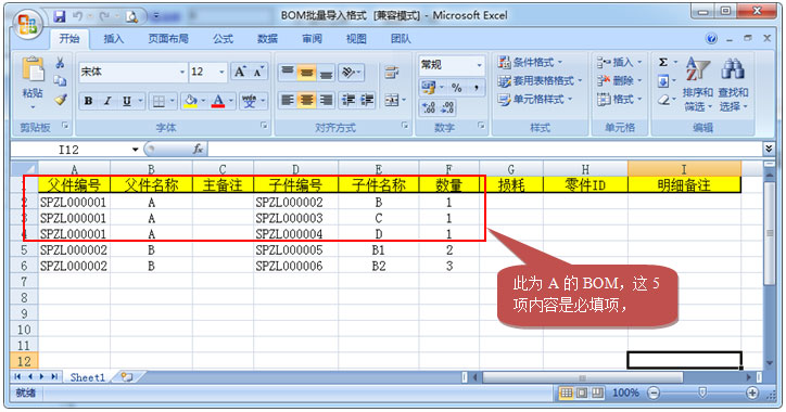 導入的EXCEL格式如下圖;在軟件的生產模塊-產品結構清單-批量導入-打開模版,可以打開批量導入的模版