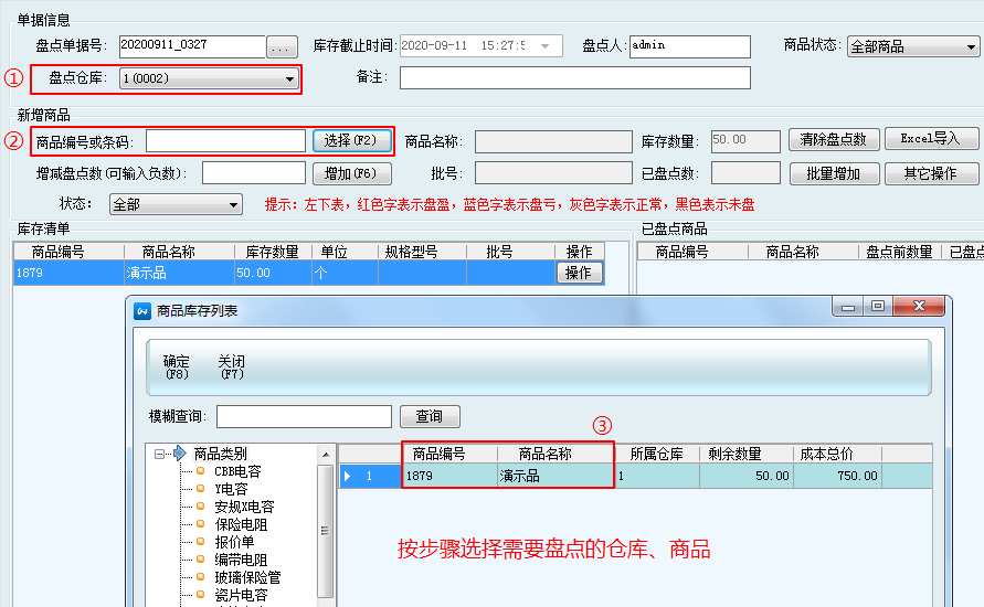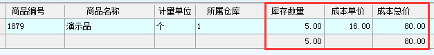 如:演示品 在倉庫1 庫存余50個 成本15元