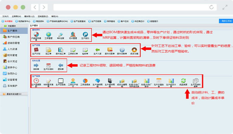 以生產(chǎn)制造管理為核心,其管理功能包括銷售、采購(gòu)、庫(kù)存、生產(chǎn)和財(cái)務(wù)等。通過(guò)信息化解決行業(yè)管理問(wèn)題,滿足各企業(yè)科學(xué)管理的需求,并為制造管理提供完善的解決方案。